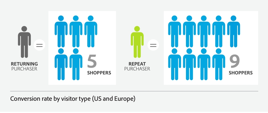 In terms of revenue per visitor (RPV), one returning customer equals five first-time shoppers in value. Whereas, one loyal buyer equals nine first-time shoppers.